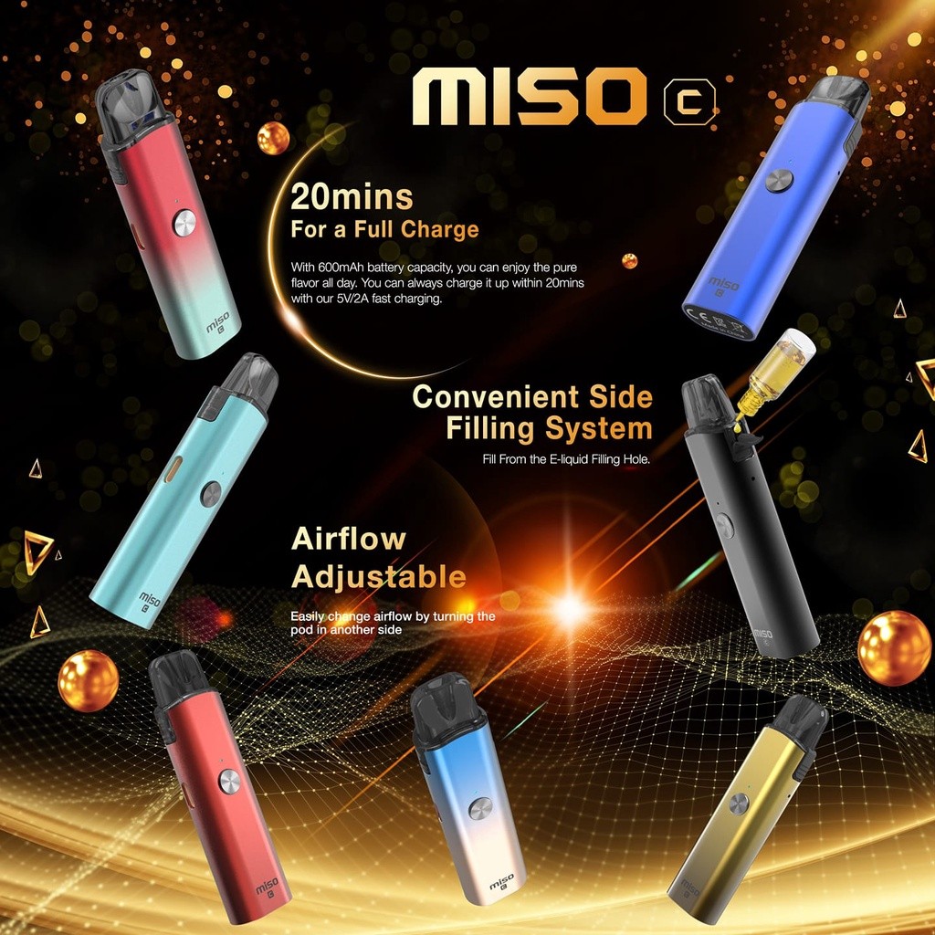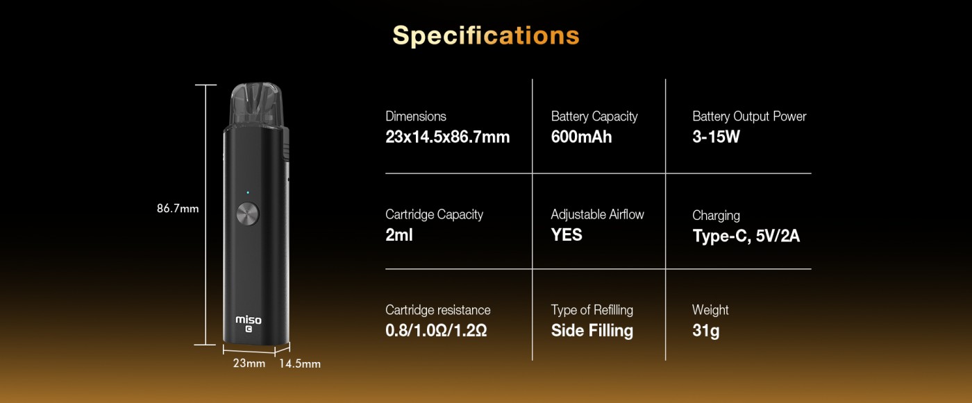 規格 尺寸:23*14.5*86.7mm 重量:29g 電容量:600mah LED電量顯示: 紅0-30% 藍31-69% 綠70-100% Type-C 20分鐘快速充電 擊發方式:氣動式/按鍵式 按鍵三下可鎖定按鍵開關 空彈容量:2ML 阻值規格:0.8/1.0 輸出功率:3-15W * 內容物 1* Univapo Miso C 主體 1* 1.0Ω空煙彈 1* 吊繩 1* Type-C充電線 1* 說明書手冊